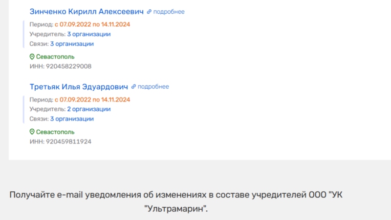 Кирилл Зинченко и сын Эдуарда Третьяка вместе возглавляли ООО «УК Ультрамарин» — начав эту деятельность и прекратив её на удивление синхронно.
