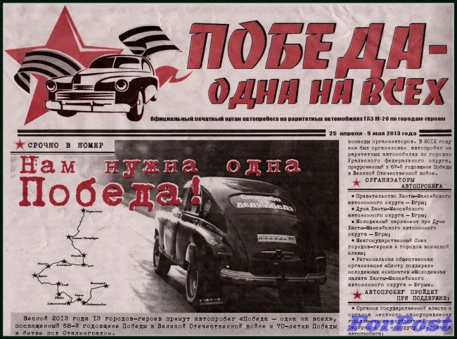 18 апреля семь участников автопробега стартовали в Ханты-Мансийском автономном округе - Югре. Самый старший участник автопробега семидесятилетний Егор Сергеевич Кравчук (посёлок Фёдоровский Сургутского района) - ровесник Сталинградской битвы, имеющий ГАЗ М-72 1956 года выпуска. "Старшим" же из автомобилей является ГАЗ М-20 Юрия Ильченко из Тюмени. Год её выпуска 1949! Остальные участники имеют следующие машины: ГАЗ М-20 1057 года у Константина Репина (Ханты-Мансийск), ГАЗ М-20 1953 года выпуска у Андрея Фунтова (Мурманск), ГАЗ М-20 1953 года выпуска у Игоря Кощеева (Тюмень), ГАЗ М-20 (кабриолет) 1953 год выпуска у Вячеслава Баскова (Екатеринбург), и ГАЗ М-20 1954 год выпуска у Рустама Гаджиева (Нягань).