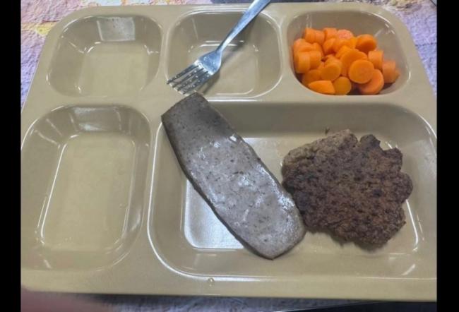 Морпехам подают на обед полупустые подносы, например, с небольшой порцией измельчённого мяса и тортильей или горстью варёной моркови, сухой мясной котлетой и серым переработанным мясом.