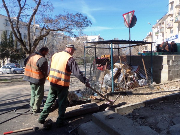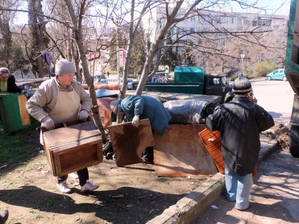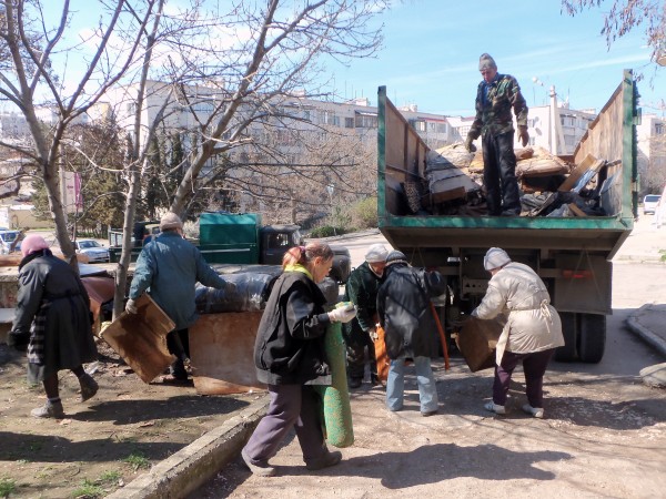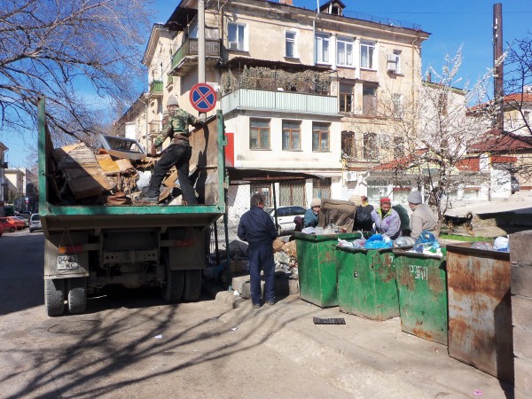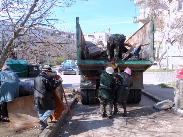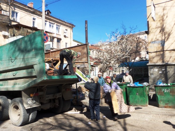 РЭП-17 направил нескольких дворников со своих обычных участков на улицу Балаклавскую, чтобы ликвидировать свалку в приямке дома №6. Пожилым женщинам пришлось грузить в высокий борт самосвала тяжелый строительный мусор, брошенный хозяевами арендованного подвальчика после своего ремонта. За зиму он быстро «оброс» бытовым мусором и прошлогодней листвой.