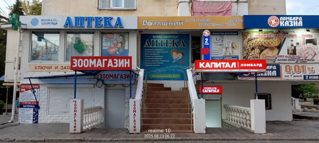 Эта пристройка-надстройка, в законности которой у горожан большие сомнения, выросла в 2000-х годах. К доминирующему верхнему ярусу ведет лестница в аптеку и хозяйственный магазин. Или всё-таки в ломбард? Помещения соединены с двумя угловыми квартирами через когда-то наружную капитальную стену.