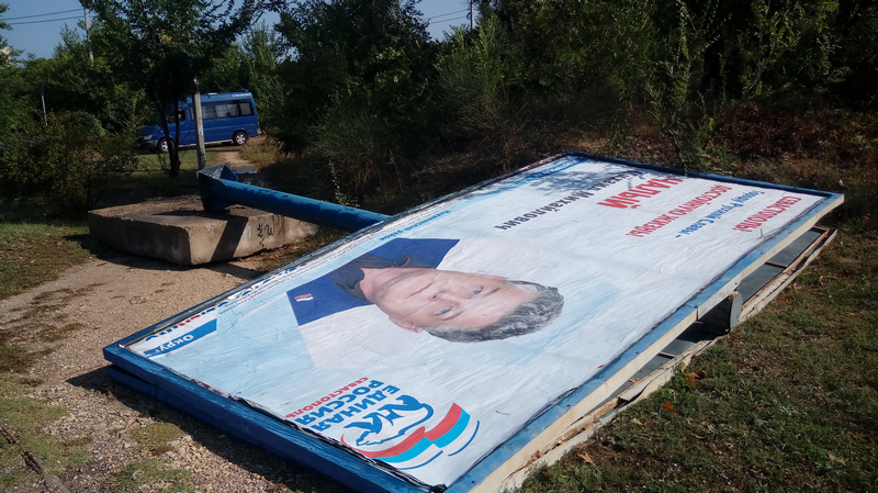 В Севастополе на улице Генерала Мельника упала громадная металлическая конструкция билборда с размещённым на нём предвыборным плакатом «Единой России». Однако, по предварительной информации, падение конструкции случилось не из-за сильного дождя и ураганного ветра, обрушившихся 4 августа на Севастополь, а, возможно, по причине чьего-то злого умысла.