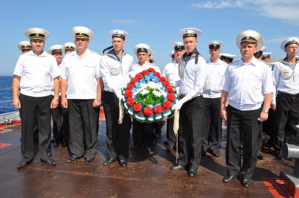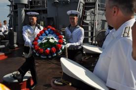 В честь одной из самых громких морских побед в истории отечественного флота на БДК состоялось торжественное построение экипажа и роты почетного караула. После краткого информационного сообщения о Чесменском сражении в памятных координатах, указанных в приказе Главнокомандующего Военно-Морским Флотом как место отдания воинских почестей, на воду был спущен венок и прозвучал Гимн Российской Федерации.