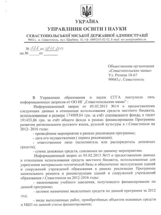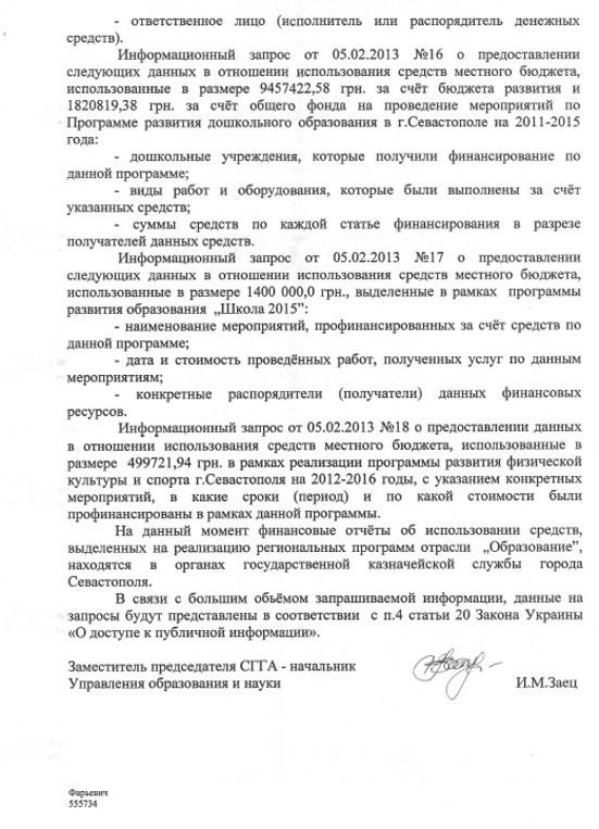 Управление образования и науки Севастополя, руководимое Заец И.М., отказывается представлять информацию о конкретных работах, проведенных за счет средств местного бюджета. ОО ИГ «Севастопольские мамы» направило информационный запрос с целью детализации информации об использовании средств местного бюджета на образование. Ответ был достаточно прост: «Информацию представить не можем. Документы в казначействе». То есть получатель и распорядитель денег, Управление образования Севастополя, не помнит, не знает, а главное не хочет говорить, как и когда потратило 37 млн. грн. Странная избирательная память образовывается у чиновников, когда речь заходит о деньгах.