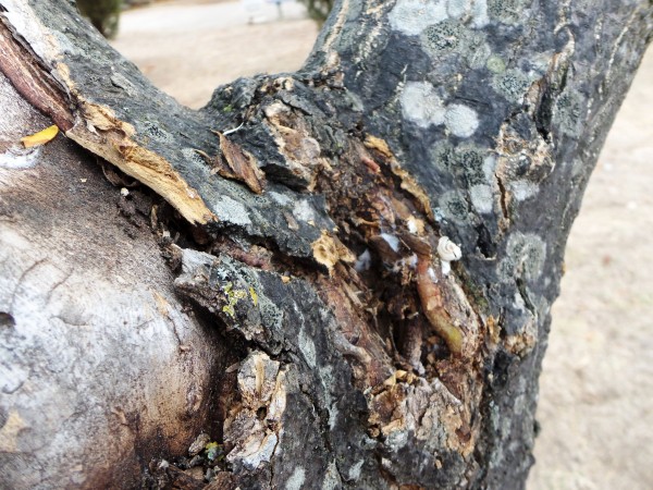 Даже беглого и непрофессионального взгляда на обнажившиеся из-под коры сломы достаточно, чтобы увидеть полностью испещрённую древоточцами и другими вредителями трухлявую древесину.