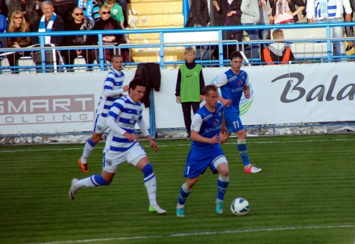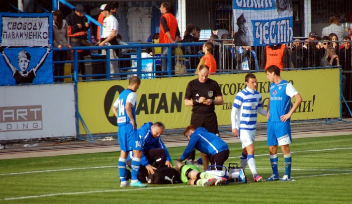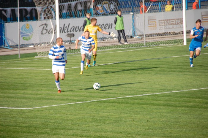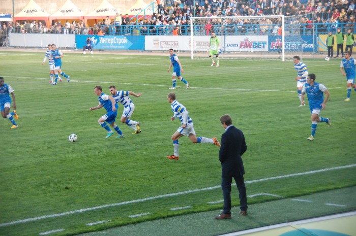 Начало второго тайма. И снова шквал атак игроков в бело-синей форме. Удар Кожанова на 47 минуте был очень опасен. Мяч едва не попал в правую девятку. На 51 минуте в запале атаки Александр Ковпак столкнулся с вратарем гостей. Пришлось вызывать медицинскую помощь голкиперу. А Ковпак получил желтую карточку.