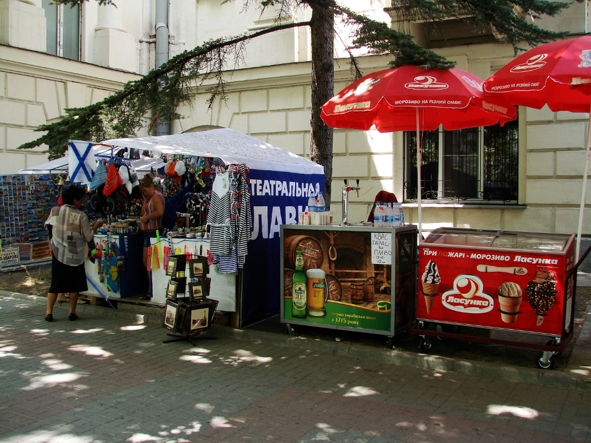 То, что тельняшки и дивные раковины с кораллами опошлены и продаются в каждом помойном и не помойном углу - уже давно не новость. Но вы посмотрите, где именно стоит эта палатка!?!?! Она стоит даже на не тротуаре - она стоит на клумбе! Несколько лет назад я лично небезуспешно цыганила у зелентрестовских тетенек, ухаживавших за этим околотеатральным зеленым уголком, пару растюшечек для садика. Теперь все вытоптано, приплясано, в общем, мертвячина какая-то.. и она привлекла не уборщиков и благоустроителей, как хотелось бы, а дельцов. Может, милиционер директорствующий над театром и этот "театральный лабаз" крышует? Как же гадко!