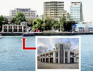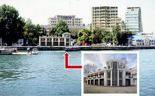 Такое ощущение, что картинка наспех вмонтирована в ситуацию. Вход расположен в обратную сторону от движения потока. Опять восточный стиль с " набитым" шпилем. Для Гурзуфа- Мб сойдет, для Севастополя не подходит. Пусть архитектор посмотрит на противоположную сторону Артбухты. И опять мелочь, теряется на рельефе. Нужно сделать всю фотофиксацию набережной, пусть владельцы объединяются и строят что то приличное.