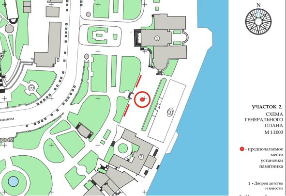 Из предложенного:участок 1-Б(ближе к морю).А на мой взгляд,лучше за Ракушкой,на клумбе ближе к морю,напротив Памятника Кораблям.Рядом стоящий туалет придется перенести....