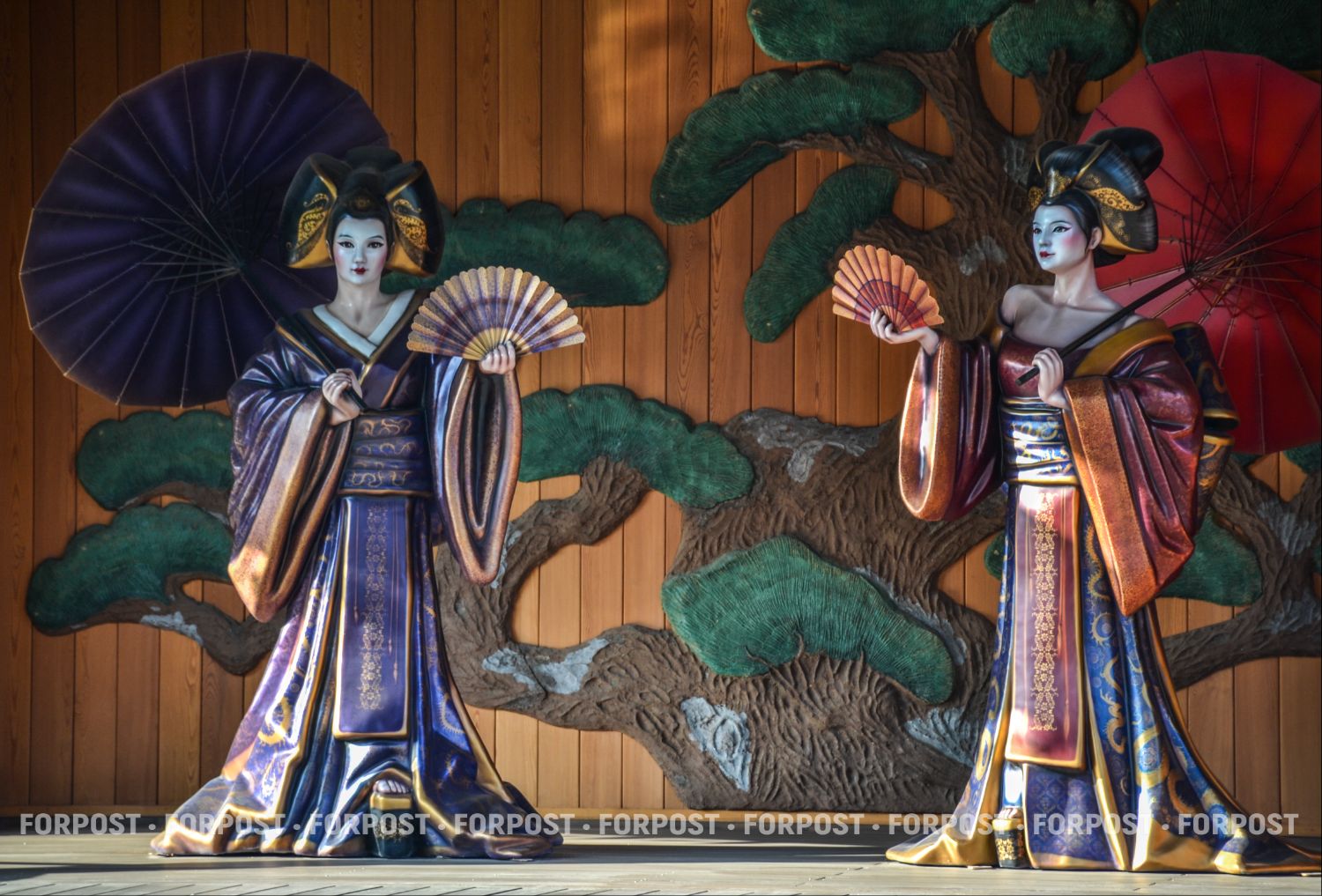 Например, театр Но на берегу пруда. Над водой словно парит сцена. А на ней — куклы актрис, которые выглядят живыми, откуда на них ни взгляни. Возникает ощущение, что, когда ты отворачиваешься от них, они что-то делают, но только бросаешь взгляд на них — сразу замирают.