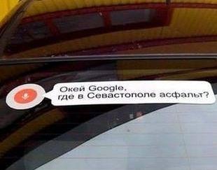 Некоторые горожане стали клеить на лобовые стёкла своих авто достаточно большие наклейки с фразой по аналогии с известной рекламой новой услуги Google: «Окей Google. Где в Севастополе асфальт».