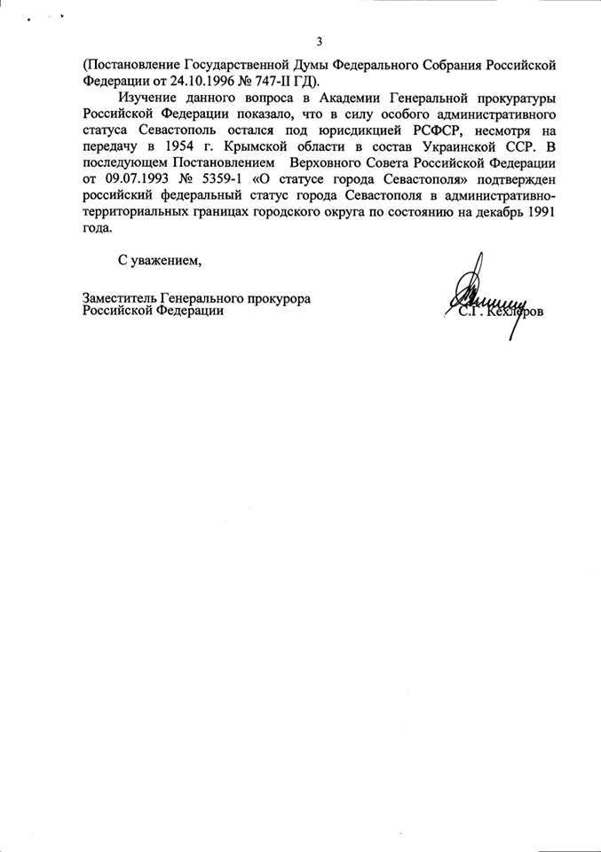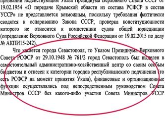 Что касается Севастополя, то в силу его особого административного статуса, утверждённого в 1948 году, город остался под юрисдикцией РСФСР, несмотря на передачу Крымской области. Это подтвердил Верховный Совет Российской Федерации своим постановлением «О статусе города Севастополя» от 9 июля 1993 года, отмечается в документе Генпрокуратуры.