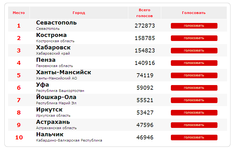 Севастополь держит первенство в рейтинге городов России: он набрал уже 272 873 голоса.
