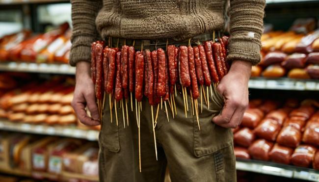 Обнаружившие недостачу десятков палок колбасы сотрудники магазина обратились в полицию. Просмотр камер наблюдения позволил участковому определить и задержать мужчину.