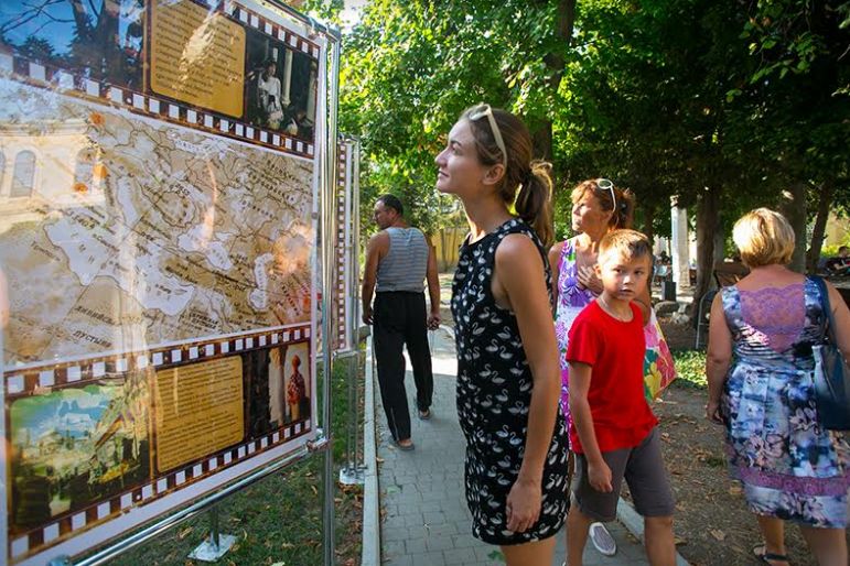 С самого утра 27 августа в Итальянском дворике работала тематическая выставка «Херсонес. Камера. Мотор», где демонстрировались фоторепродукции кинокадров из фильмов, съёмки которых в разное время проходили на древних руинах.