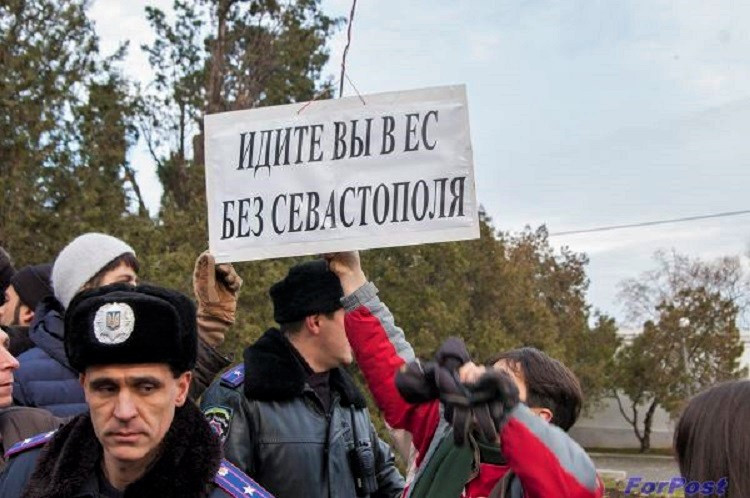 "Еще в половине второго пространство центральной площади Севастополя лениво измеряли шагами небольшие милицейские группы. На площади, как и летом, отчаянно мегафонили катерные зазывалы и все так же бродили неистребимые господа-голубятники. В целом, картинка была довольно мирная. Севастопольским евроинтеграторам сложно было бы обосноваться у ног славного адмирала, потому как там заблаговременно собрались севастопольцы с традиционной атрибутикой - триколорами и морскими Андреевскими флагами. Так что движение народных масс к 14-00 началось в сквере возле горсовета. Уже стало традицией, что представители органов внутренних дел встают живым щитом между севастопольцами и евросевастопольцами. Внимательным взглядом можно было различить, сколько людей здесь собралось по зову души, а сколько - по зову службы. Евромитинг оказался жалким зрелищем - как по посещаемости, так и по риторике. Удалось пообщаться с некоторыми участниками импровизированного анти-евро-пикета. На вопрос, почему, по их мнению, севастопольцы не слишком активно обозначают свое мнение о происходящих событиях, почему в городе не дается еще более активный отпор лживой евроэкспансии, ответ последовал без изысков: партия власти кредит доверия исчерпала, а альтернатива не видна в принципе" - рапортовали наши народные корреспонденты.