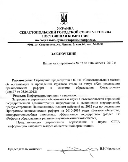 В начале апреля активисты ОО ИГ «Севастопольские мамы» направили в адрес Севастопольского городского Совета народных депутатов инициативу севастопольских родителей собраться за круглым столом с депутатами и представителями управления образования и публично обсудить проблемы севастопольских школ и детских садов.