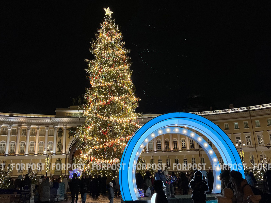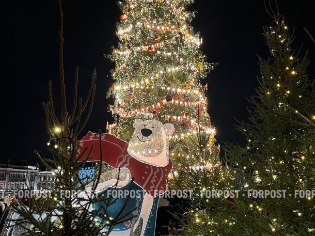 Центром всех культурных мероприятий неизменно остается Дворцовая площадь. В этом году здесь установили 30-метровую ель, украшенную в ретростиле. Рядом установлены деревья поменьше с праздничными инсталляциями.