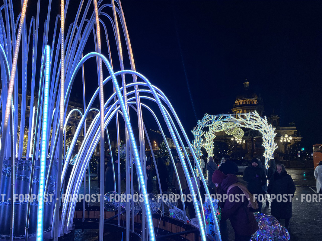 Пройдя чуть дальше от Исаакия, можно очутиться у сада Мариинского дворца на Синем Мосту. Абсолютно все инсталляции сопровождаются небесно-голубым светом гирлянд и множеством украшенных деревьев.