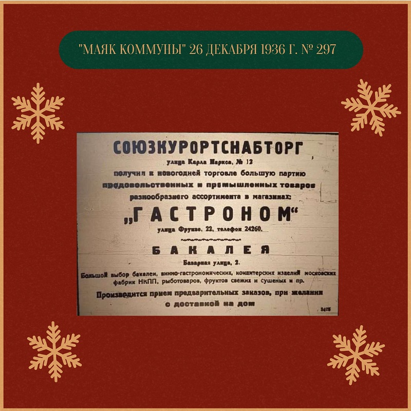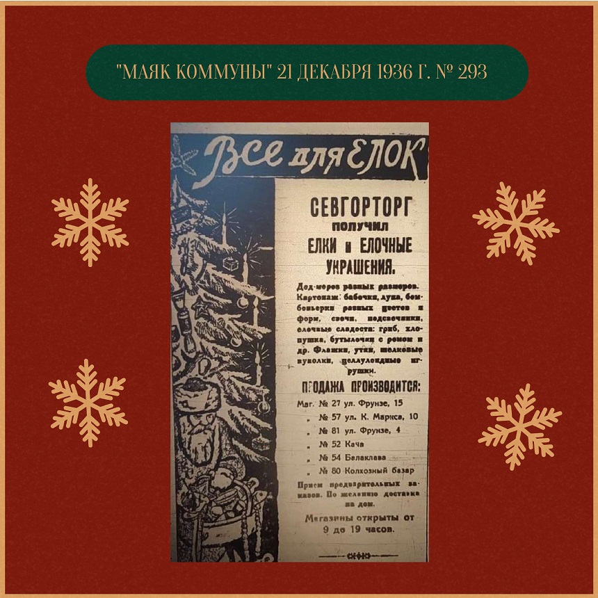 Получить самую достоверную информацию (что называется, из первых рук) им помогла газета «Маяк коммуны» (с 1942 года - «Слава Севастополя»). Вот, например, три объявления за 1936 год. В первом Севгорторг извещает горожан о прибытии в город новогодних товаров. Время украсить елку еще есть: до Нового года 10 дней. Предусмотрена, что удивительно, даже доставка на дом. И как же трогательно это перечисление «картонажа» (т. е. картонных птичек и бабочек) и прочих праздничных товаров!
