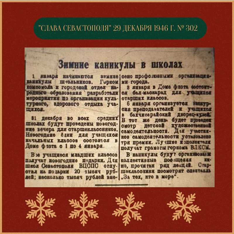 Еще два свидетельства - уже из 1946 года. Первое объявление в газете «Слава Севастополя» рассказывает, чем порадуют детей во времена школьных каникул. Особенно волнующим событием наверняка стал «ряд лекций». А всем младшеклассникам обещаны подарки, на которые ВЦСПС выделил Севастополю 20 тысяч рублей.