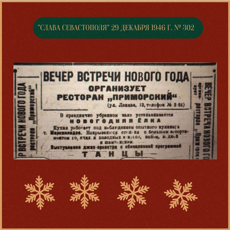 Ну а пока Новый, 1947 год еще не наступил, самое время задуматься о его проведении. В ресторане «Приморский» горожан ждали красивая елка, угощение от опытного кулинара Марквиладзе и что самое удивительное - джаз-оркестр с обновленной танцевальной программой!