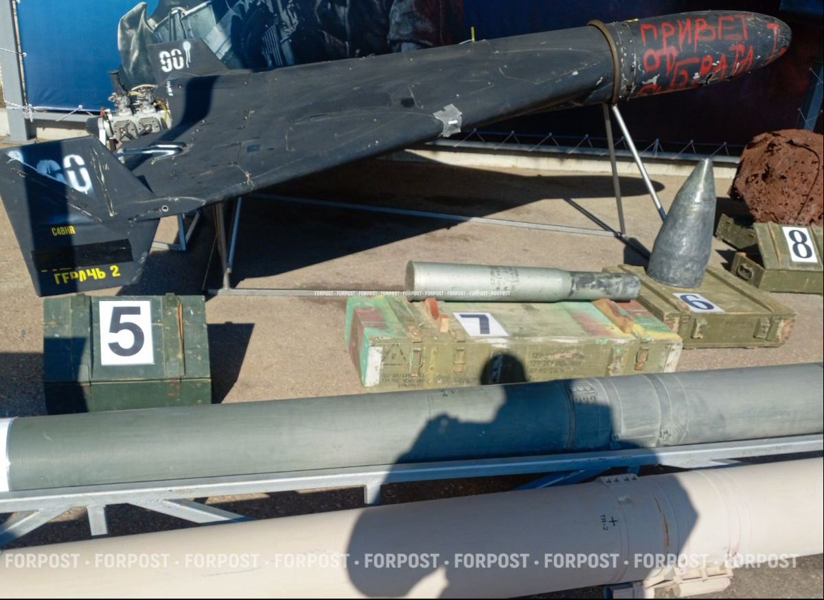 Здесь можно увидеть части зенитного комплекса «Панцирь-С1», беспилотник «Герань-2», а рядом украинский квадрокоптер кустарного производства «Баба-Яга», ракету «Точка-У», ракету-дрон «Пекло». На некоторых корпусах остались нанесённые вручную «троллящие» противника надписи: «Привет от брата», «Засiб для очищ..ня вiд ..д…», и тому подобное.