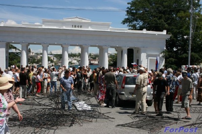 Для тех, кому эта история незнакома: 5 июля 2008 года жители Севастополя дали бой украинским силовикам и ВСУ при попытке вбить в самое сердце города — Графскую пристань — позорную табличку в честь сомнительного эпизода из истории Российского флота, когда в 1918 году один из кораблей Черноморской эскадры поднял жёлто-голубой флаг. Возмущённые горожане буквально смели кордоны из военных и силовиков, вырвали табличку из стены пристани и утопили её посреди Южной бухты.