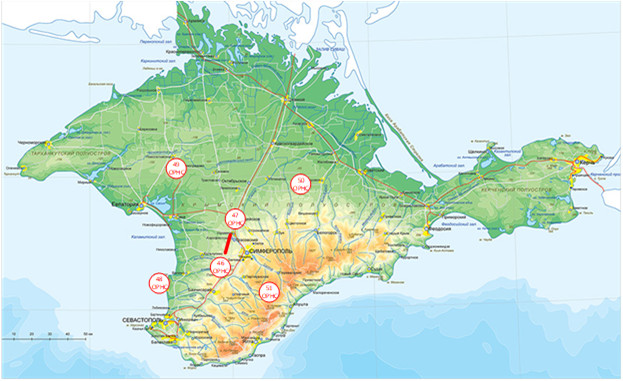 На севере находились станции: № 49 — с. Елизаветово в Раздольненском районе, № 50 — в 200 метрах от деревни Новоекатериновка, Белогорского района, № 47 — с северного торца взлётно-посадочной полосы. На юге станции размещались так: № 46 — деревня Камышинка, № 48 — на берегу моря в с. Андреевка рядом с Качей и Севастополем, № 51 на нижнем плато Чатыр-Дага на высоте чуть более 1050 м над уровнем моря.