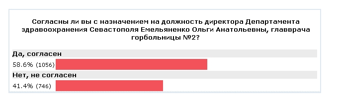 Итак, просим вас ответить на вопрос: согласны ли вы с назначением на должность директора департамента здравоохранения Правительства Севастополя Емельяненко Ольги Анатольевны - главного врача ГБУЗС «Городская больница №2»? ///////////////////////////////////////////////////////////// Кто просит? Кто такая О.А. Емельяненко? Что за халтурный "ОПРОС"?