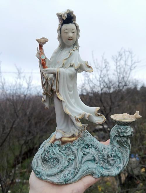 Так у неё появились несколько загадочных фигурок, про которые пока не удалось найти информацию: ни названия, ни страны или года производства. Одно из таких таинственных приобретений — богиня Гуань Инь. Дина предполагает, что родиной этой редкой статуэтки был Китай.