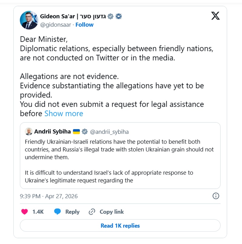 Глава МИД Израиля достаточно жестко ответил Сибиге на его заявления. По его словам, Украина не предоставила доказательств того, что зерно, пришедшее в Израиль, прибыло с захваченных РФ территорий.