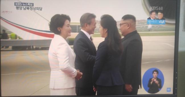 Южнокорейские СМИ вели прямую трансляцию церемонии встречи из аэропорта Пхеньяна, где Муна встретил лидер КНДР Ким Чен Ын.