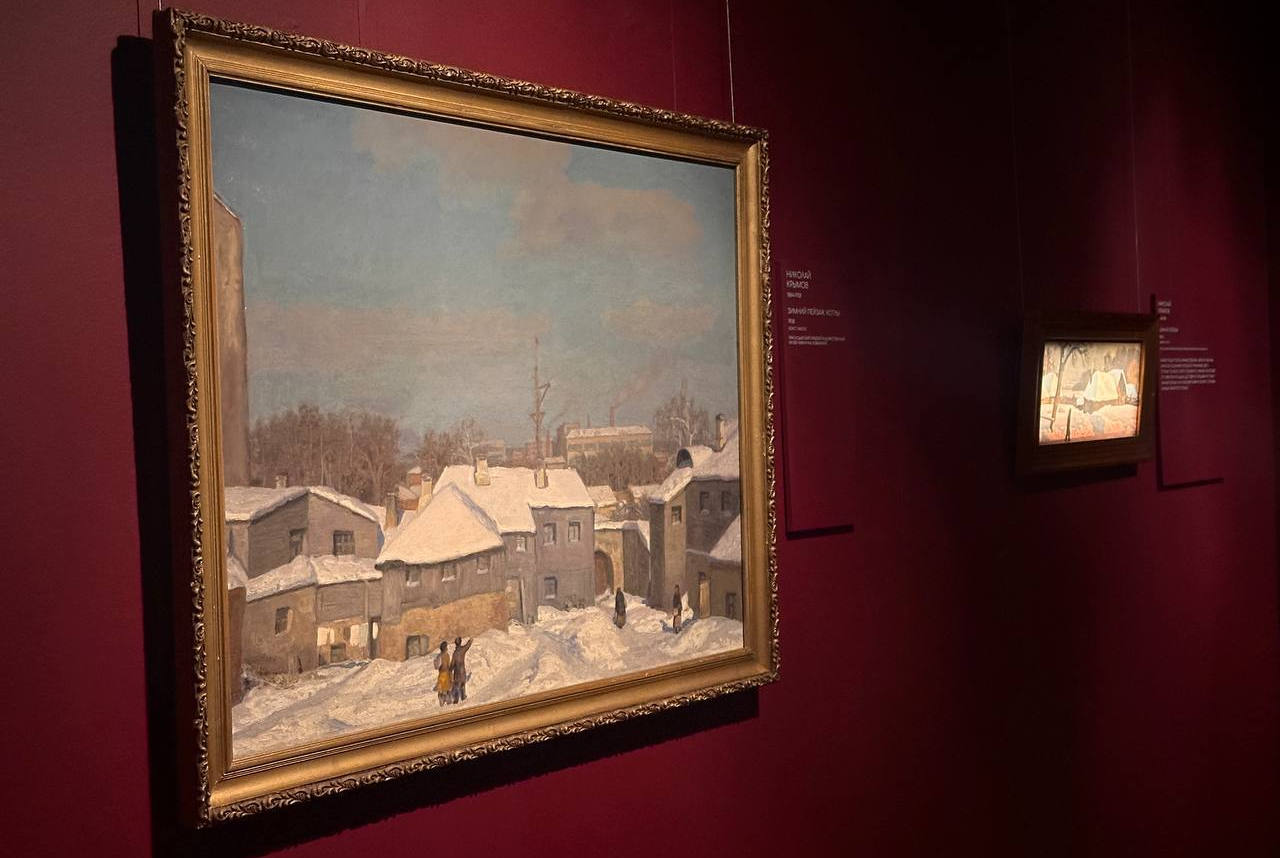 Встречает посетителей крымовское «Морозное утро» (1951), которое автор этих строк воспринял не иначе как перекличку с двумя работами Анатолия Любавина из собрания РГИ — «Розовое облако» (2024) и «Крымский мост» (2024), в сюжеты которых вплетено здание Министерства иностранных дел. Возможно, Крымов, как москвич, изобразил именно это здание, но тогда, вероятно, на этапе строительства, ведь открыли данный комплекс МИДа в 1953 году.