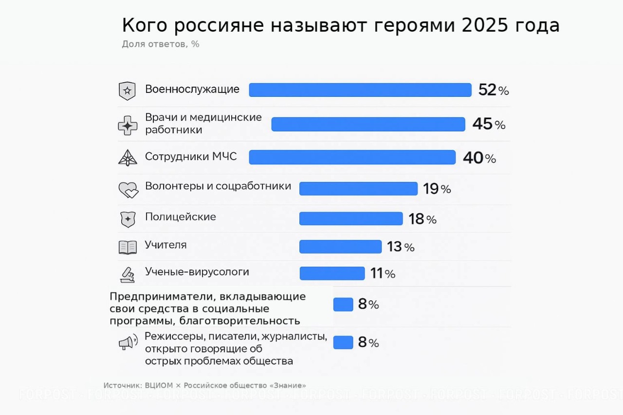 ВЦИОМ провёл исследование, кого россияне считают героями 2025 года. У людей в почёте были военные, медики, спасатели, полицейские, волонтёры и соцработники, а вот учителя и журналисты оказались на 6 и 9 месте.