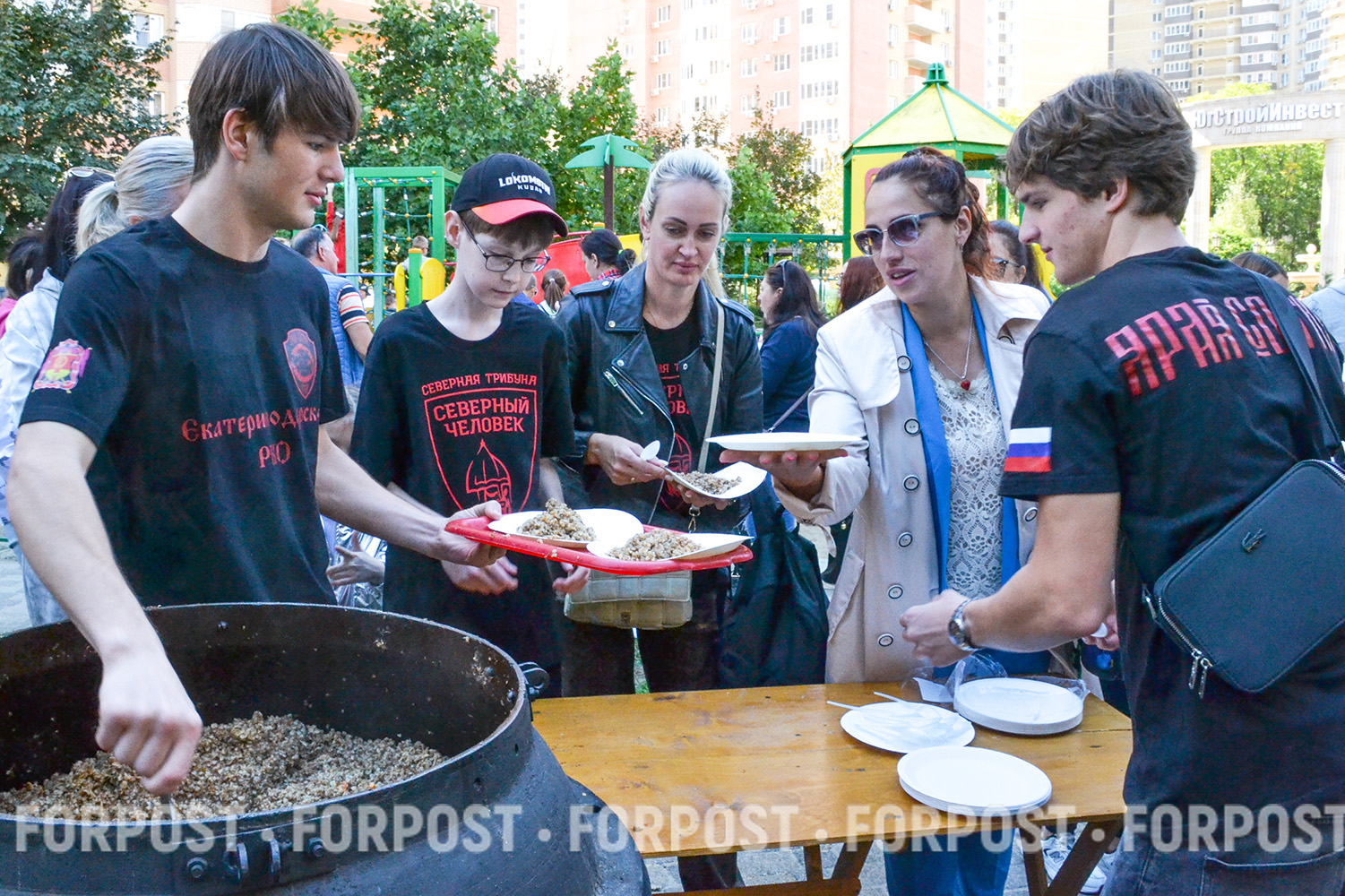 И ещё угощали — конечно, бесплатно — чаем из самовара и ароматнейшей, настоявшейся в казане гречневой кашей: за ней выстроилась гурьба едоков, с которой еле справлялись парни на раздаче. Да показывали владение шашкой и арапником.