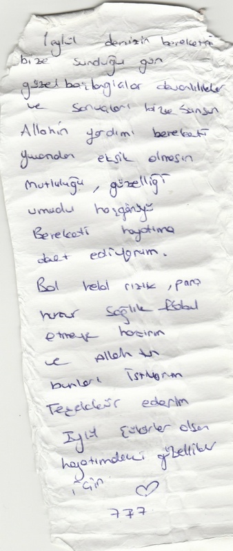 Чтобы отыскать автора, девушка написала о находке в социальных сетях, а также попросила подписчиков переслать этот пост знакомым из Турции. Она также обратила внимание, что в начале послания указана дата — первое сентября, но без года. По её предположению, скорее всего, бутылка с посланием пробыла в воде лишь несколько месяцев, потому что не успела обрасти морскими водорослями и ракушками.