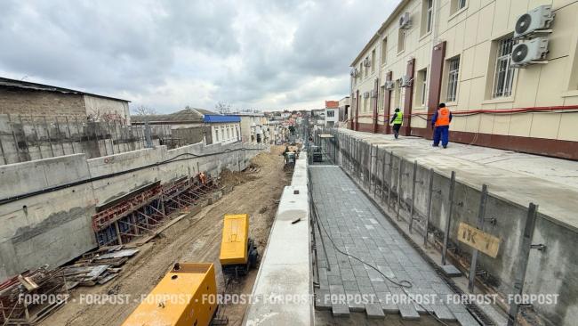 На улице Адмирала Октябрьского в Севастополе приступили к укладке плитки на тротуарах. Однако пройти по новым пешеходным зонам горожане смогут только после полной сдачи объекта — ориентировочно в июле.