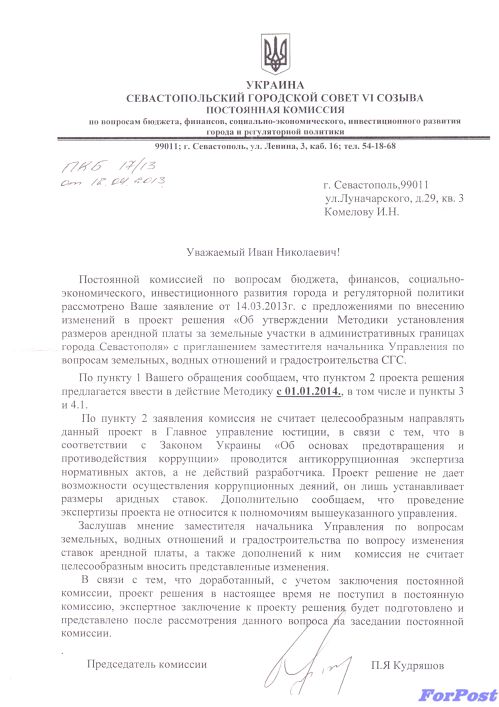 Открыто заявляю, что в настоящий момент готовлю исковое заявление в суд о противоправных действиях Севастопольского городского Совета и разработчика проекта решения городского Совета «Об утверждении Методики установления размеров арендной платы за земельные участки в административных границах города Севастополя». Убеждён, что свои законные интересы арендаторам необходимо защищать, прежде всего, своей активной позицией! Пока мы молчим, чиновники, отдельные депутаты Севастопольского городского Совета, голосующие за такие проекты решения, будут продолжать чинить произвол в отношении своих избирателей. Вот только загадкой для меня остается вопрос, почему по информации сайта Севастопольского горсовета http://sevsovet.com.ua/index.php/all-reshenie/7219-609 замечания и предложения в методику в срок до 15 марта 2013 года поступили только от Комелова И.Н., неужели никого из предпринимателей этот вопрос не взволновал?!