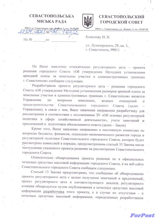 Мое предложение о проведении общественного обсуждения проекта решения городского Совета «Об утверждении Методики установления размеров арендной платы за земельные участки в административных границах города Севастополя» с участием представителей постоянных комиссий Севастопольского городского Совета, управлений Севастопольской городской государственной администрации, Государственной налоговой службы в городе Севастополе, представителей общественности и заинтересованных субъектов хозяйствования, по мнению должностных лиц городского Совета, не соответствует действующему законодательству Украины.