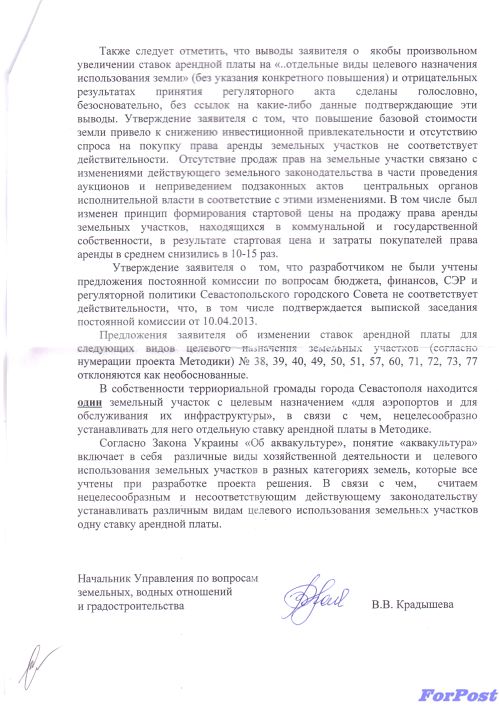 Никаких аргументов в пользу экономической целесообразности повышения арендных ставок за землепользование начальник управления Крадышева В.В. в своем письме от 10 апреля 2013 года №07-02/225 не смогла привести. К примеру, предложение о внесении в Методику ставки арендной платы за аренду земельных участков с целевым назначением «для строительства и обслуживания аэропортов и их инфраструктуры» отклонено по причине того, что в собственности территориальной громады Севастополя находится только один такой участок. Но он же есть!
