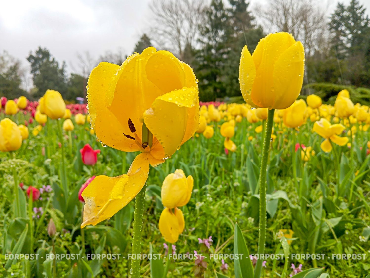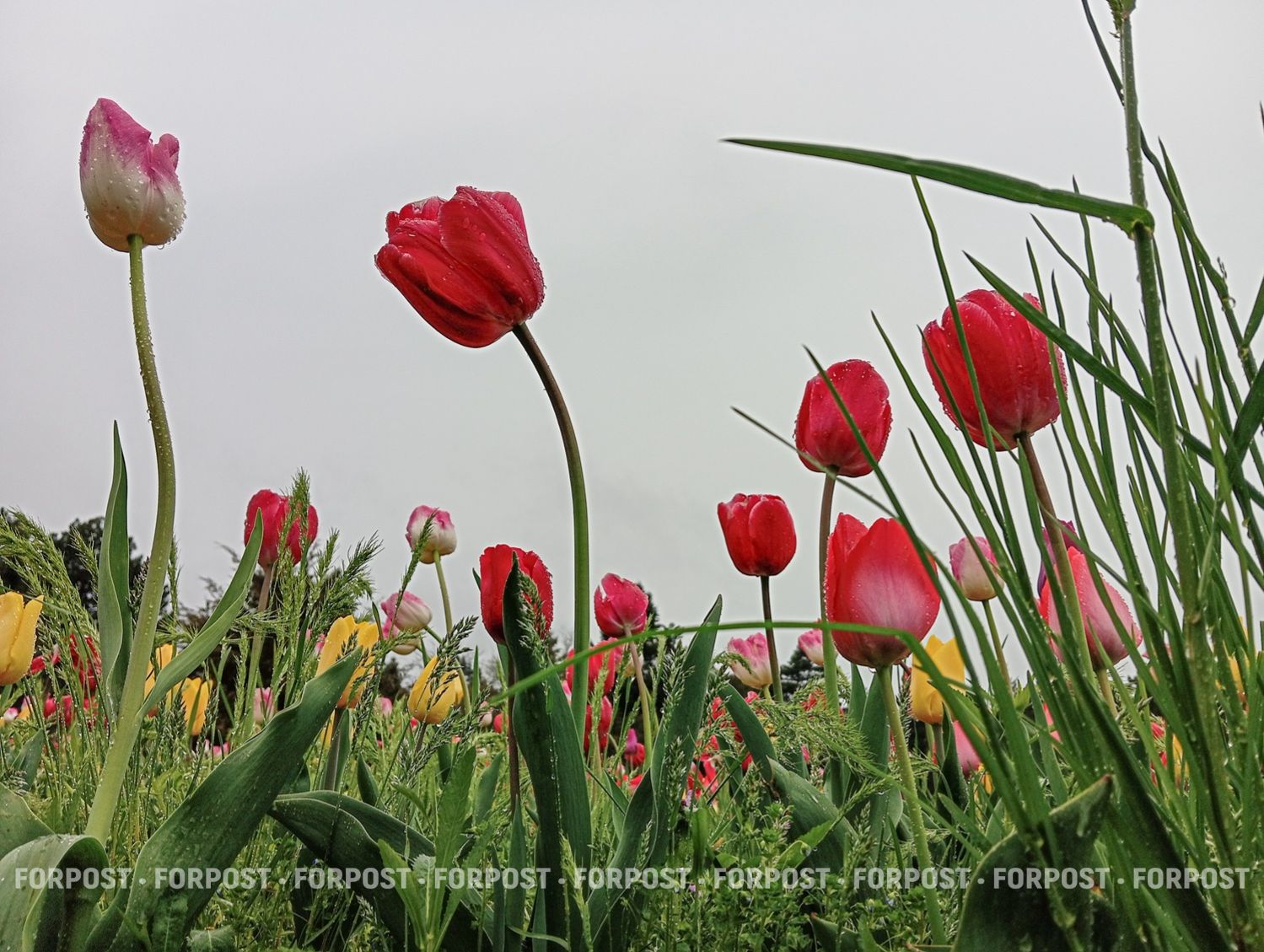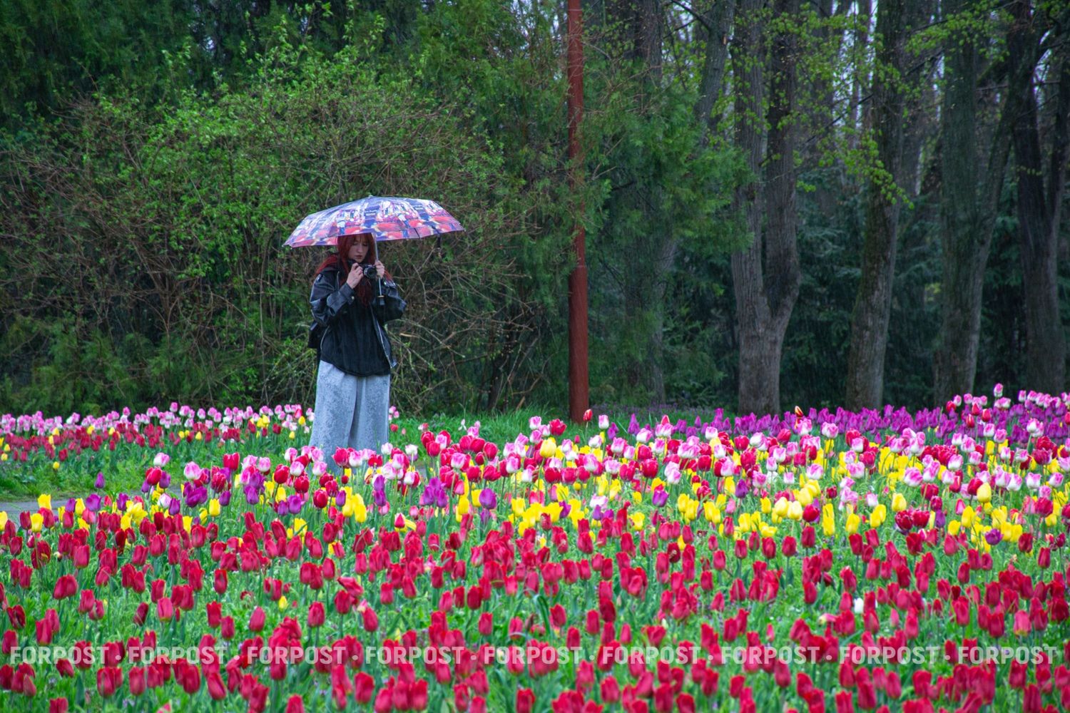 Когда идёт дождь, людей мало, и цветы выглядят иначе: капли собираются на листьях, головки тяжелеют, но тюльпаны не закрываются — они продолжают стоять прямо.