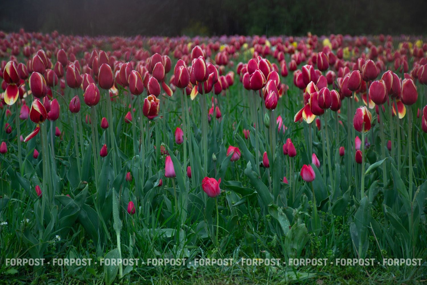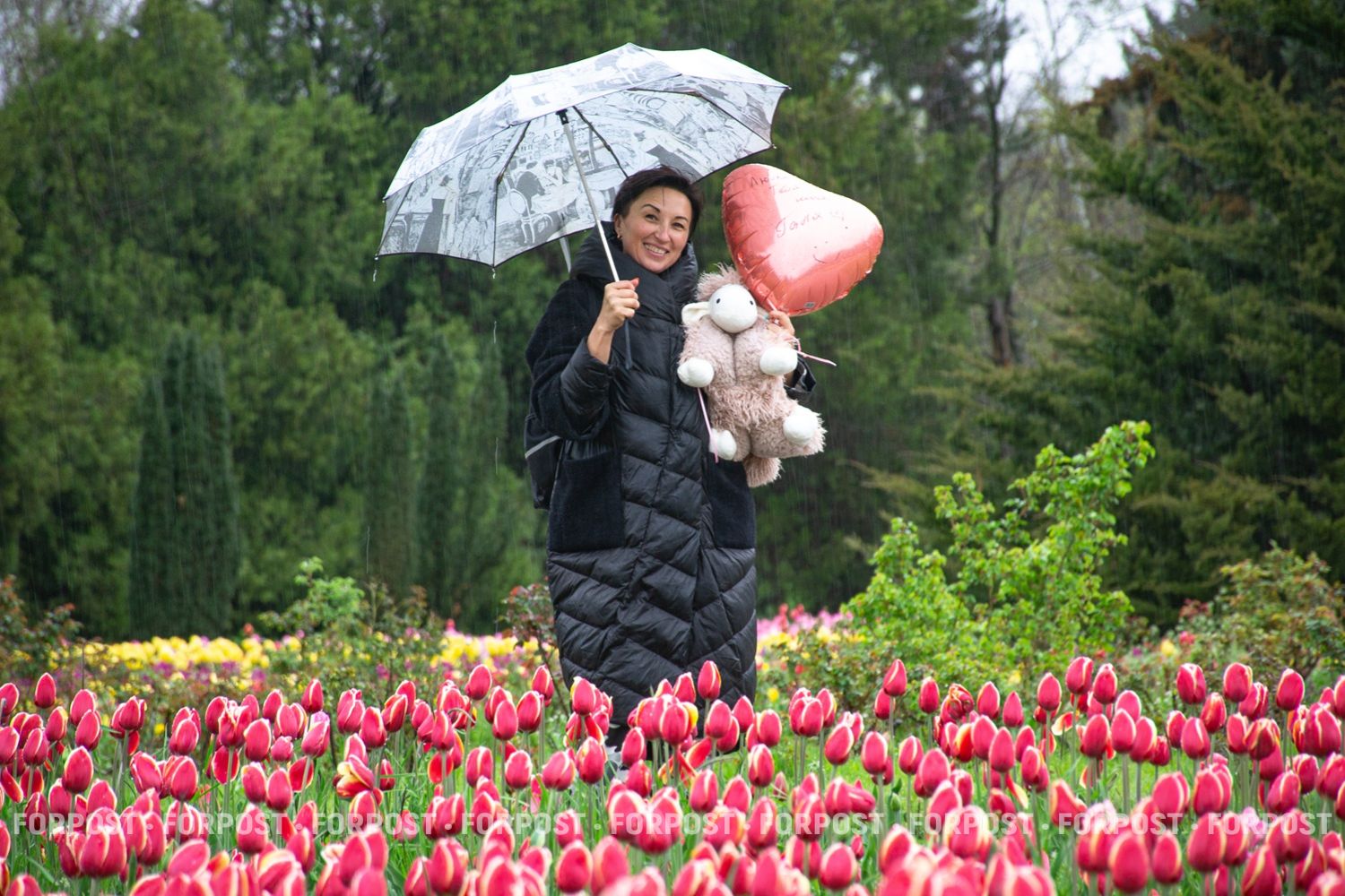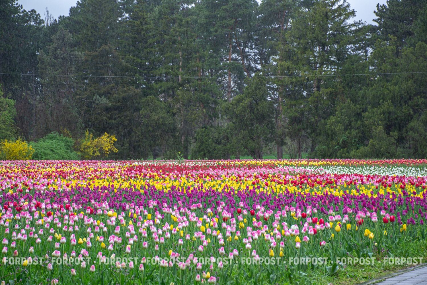 Когда идёт дождь, людей мало, и цветы выглядят иначе: капли собираются на листьях, головки тяжелеют, но тюльпаны не закрываются — они продолжают стоять прямо.