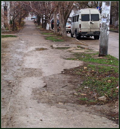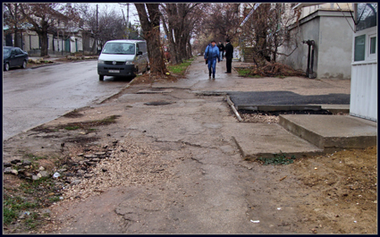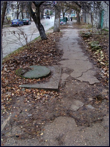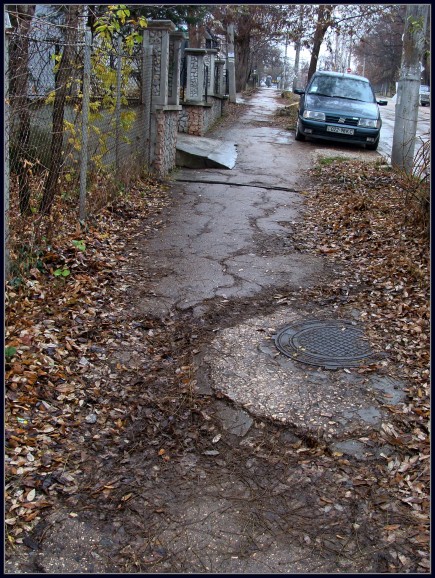 Если правая сторона тротуара, вернее, того, что от него осталось, ещё как-то проходима (хотя бы в сухую погоду), то левая представляет собой набор изощрённых ловушек для получения травм различной степени тяжести прохожими всех возрастов: