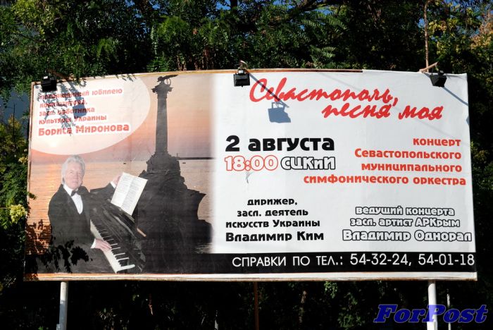 Вчера в Центре культуры и искусств состоялся концерт севастопольского муниципального симфонического оркестра по управлением заслуженного деятеля искусств Украины Владимира Кима. Концерт был посвящён севастопольскому композитору, музыканту, основателю молодёжного эстрадно- симфонического оркестра Дворца детского и юношеского творчества заслуженному работнику культуры Украины Борису Алексеевичу Миронову, который недавно отметил свой 80-летний юбилей… И не случайно концерт в честь юбиляра назывался «Севастополь-песня моя!», потому что одна из заглавных песен, написанных Маэстро, стала своеобразным гимном нашего города…