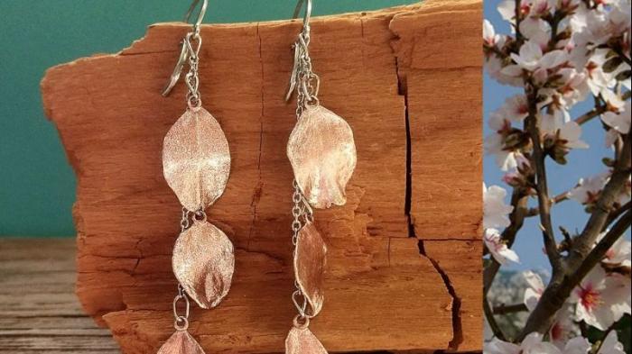 Обмеднëнная хвоя секвойядендрона с Чатыр-Дага, серьги из листьев миндаля, берёзы, боярышника и гибискуса, чокер с цветком абрикоса, «речное» колье из листьев и ветвей ивы с берегов Салгира, лунница с листьями дуба с горы Таш-Джарган — всё это творения крымчанки Алёны Елисеевой.