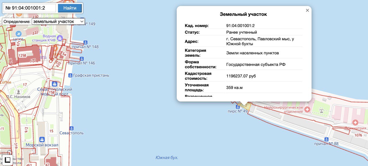 Речь идет о земельном участке с кадастровым номером 91:04:001001:2 площадью около 359 квадратных метров, расположенном на Павловском мысе, а также о сооружении «причал № 87» с кадастровым номером 91:04:001001:103, площадью 74,3 квадратных метра, по адресу: спуск Госпитальный, 28.