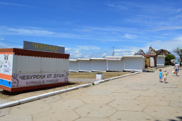 В Учкуевке же большой пляж, если его сравнивать с Солнечным или Песочным, выглядел почти хорошо: более чистый, деревянные дорожки, свежеокрашенные навесы. Но ни одного спасателя. И вид на море «спрятан» за убогими и уродливыми ларьками, ещё не открытыми своими хозяевами. Владельцы же кафе только–только готовятся к сезону, убирая и подлатывая свои заведения.