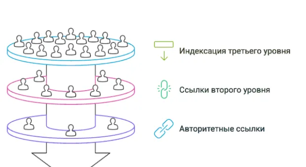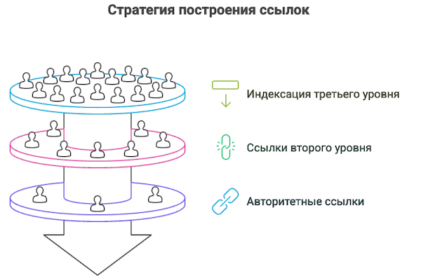 Подход многоступенчатого линкбилдинга представляет собой пирамидальную структуру с несколькими уровнями, каждый из которых выполняет специализированную функцию.