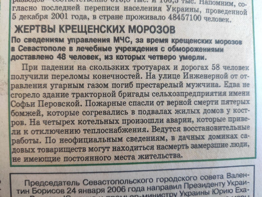 К сожалению, мороз привёл и к человеческим жертвам. По данным газеты «Слава Севастополя», как минимум четыре человека зимой 2006 года замёрзли насмерть.